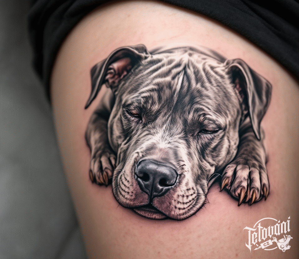 Tetování zvíře, pes, spící pitbull na stehně
