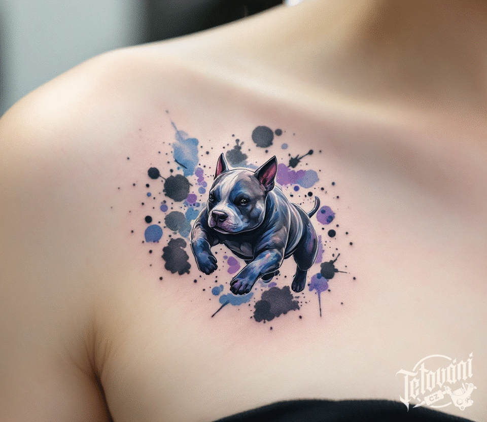 Tetování zvíře pes staffbul s barvami pod klíční kost