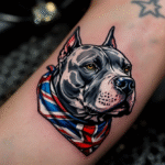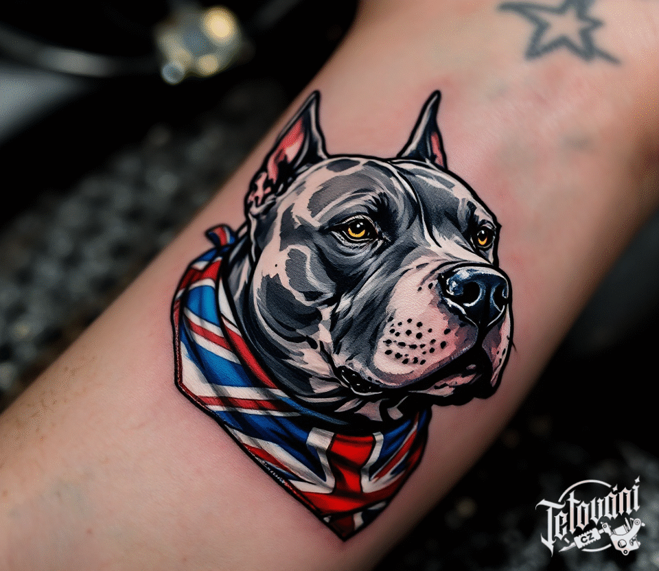 Tetování zvíře pes staffbul se šátkem na ruku