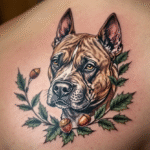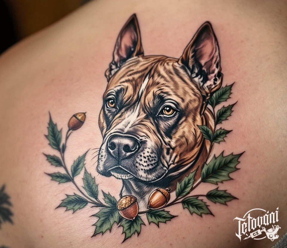 Tetování zvíře pes staffbull s dubovou větví na lopatku
