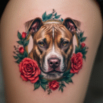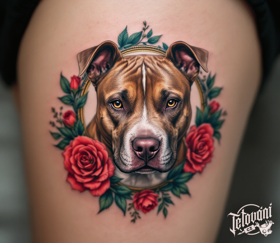 Tetování zvíře pes Staffbull s růžemi na stehno