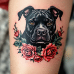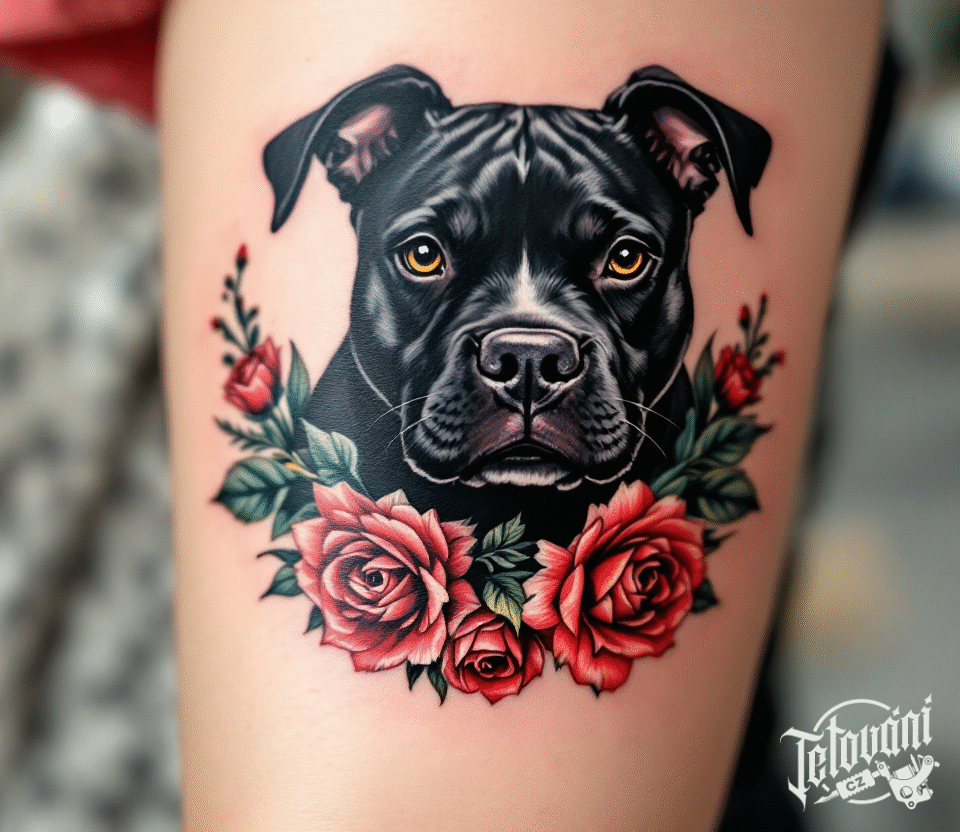Tetování zvíře, pes, staford s růžemi na lýtku