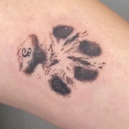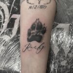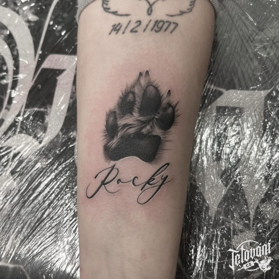 Tetování zvíře, psí tlapka se jménem na předloktí