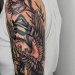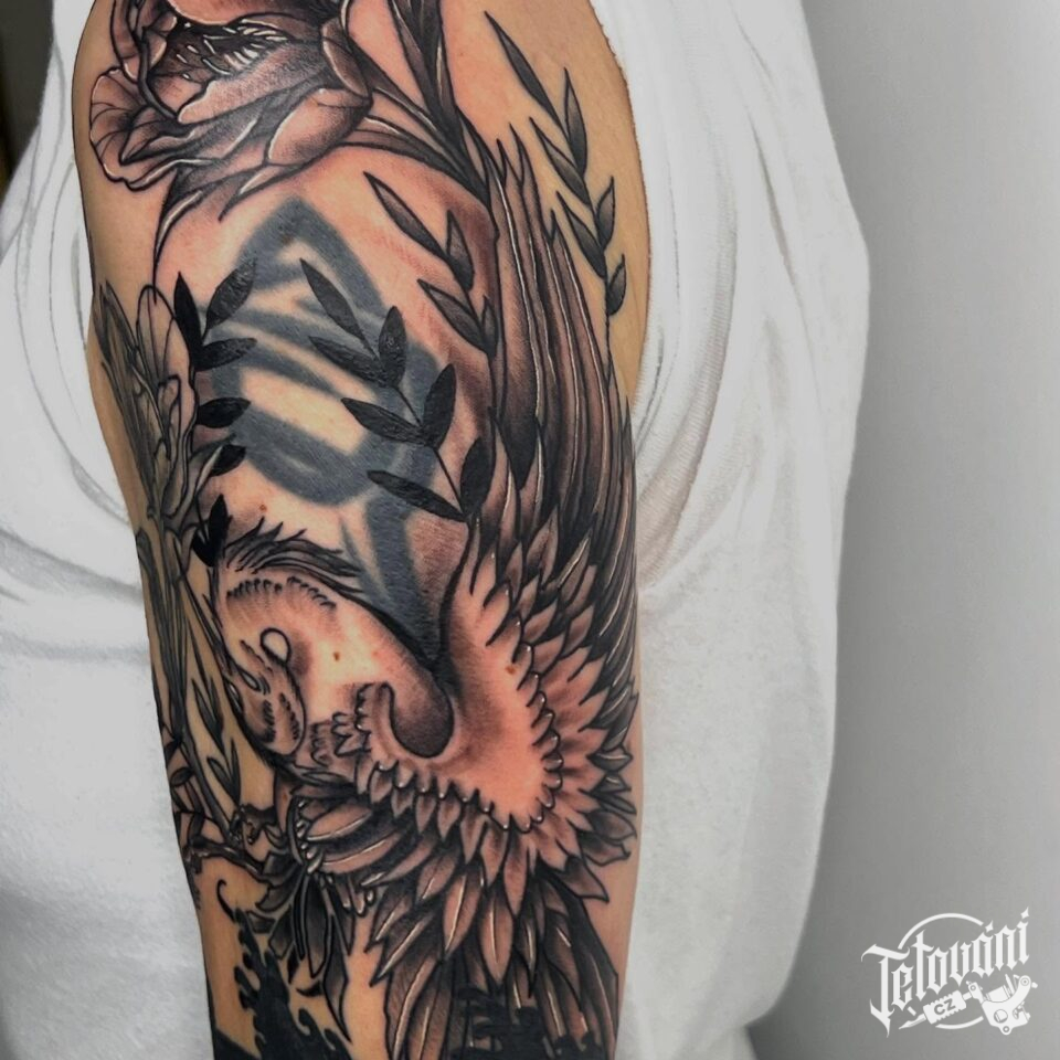 Tetování zvíře, pták a květiny na rameni