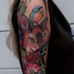 Tetování zvíře pták a srna, květiny na rameno