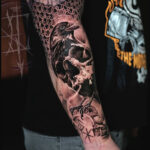 Tetování zvíře, pták, havran a lebka na předloktí