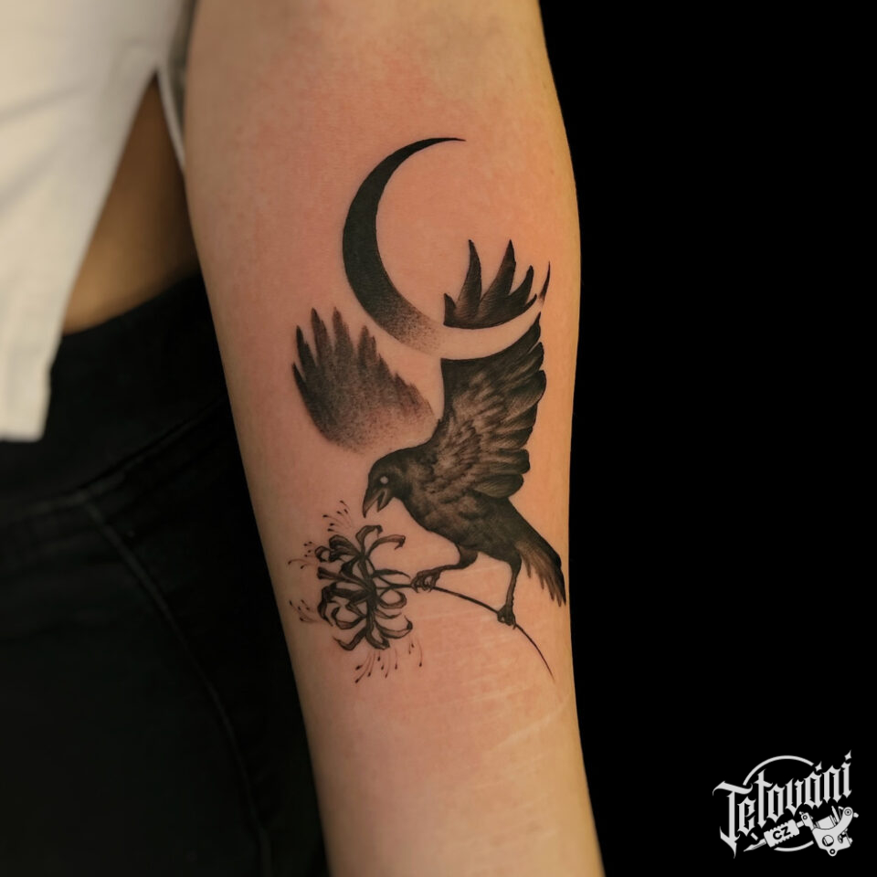Tetování zvíře, pták, havran a Měsíc na předloktí