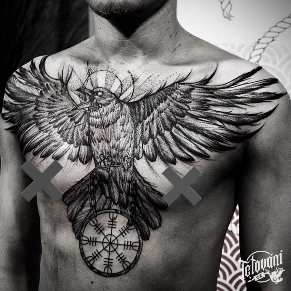 Tetování zvíře, pták, havran na hrudi