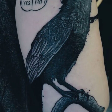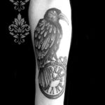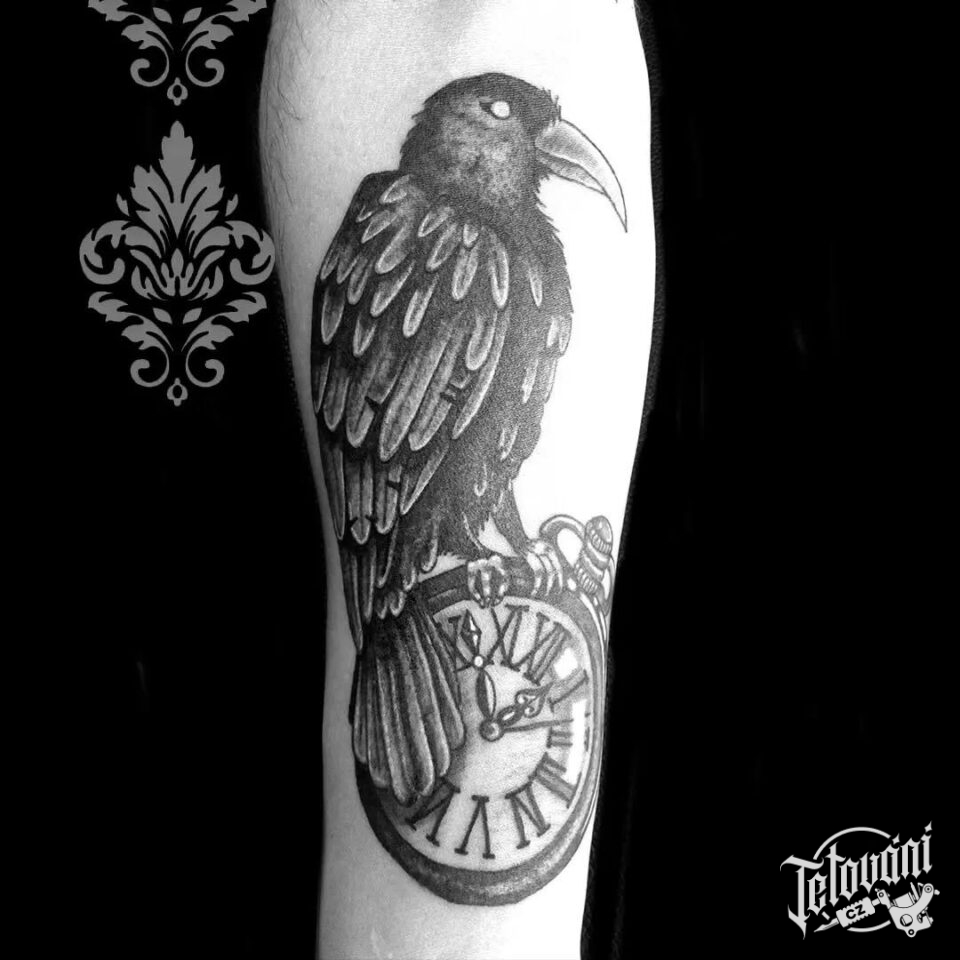 Tetování zvíře, pták, havran s hodinami na předloktí