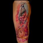 Tetování zvíře pták, hodiny, květiny na bok stehna
