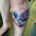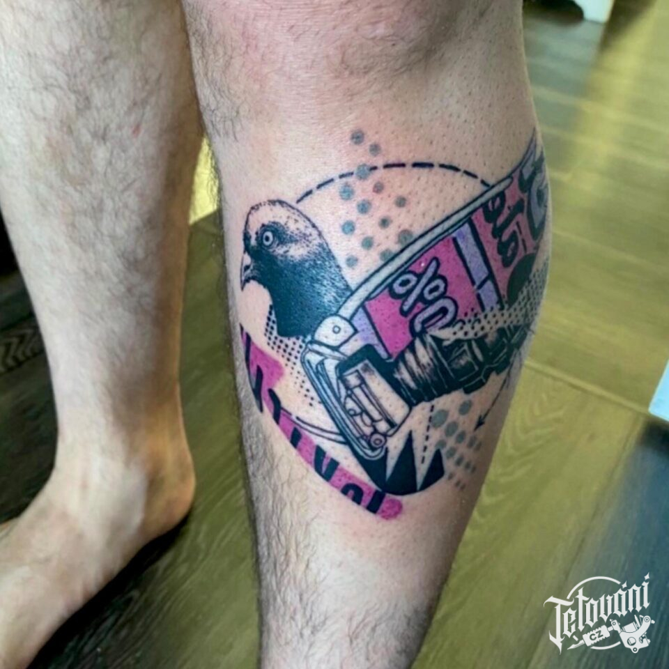 Tetování zvíře, pták, holub a nápisy na holeni
