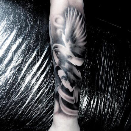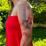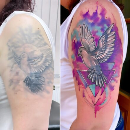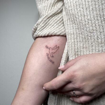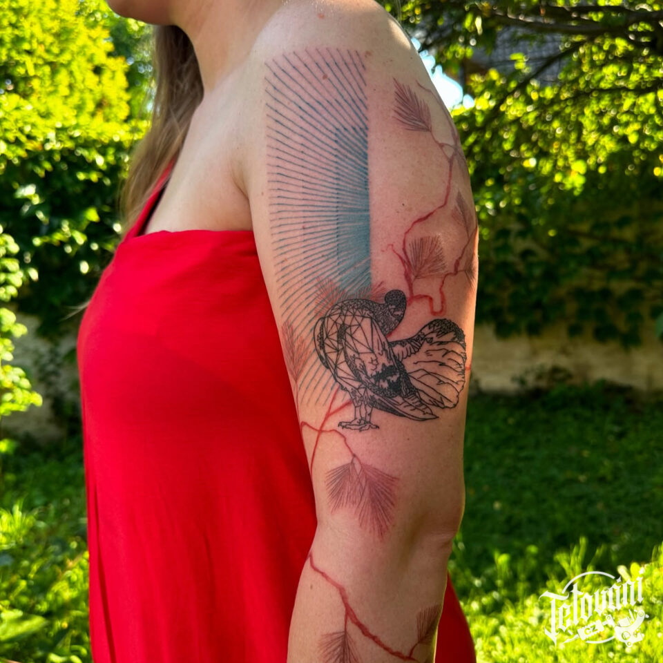 Tetování zvíře, pták, holubice, čáry, pruhy na rameni