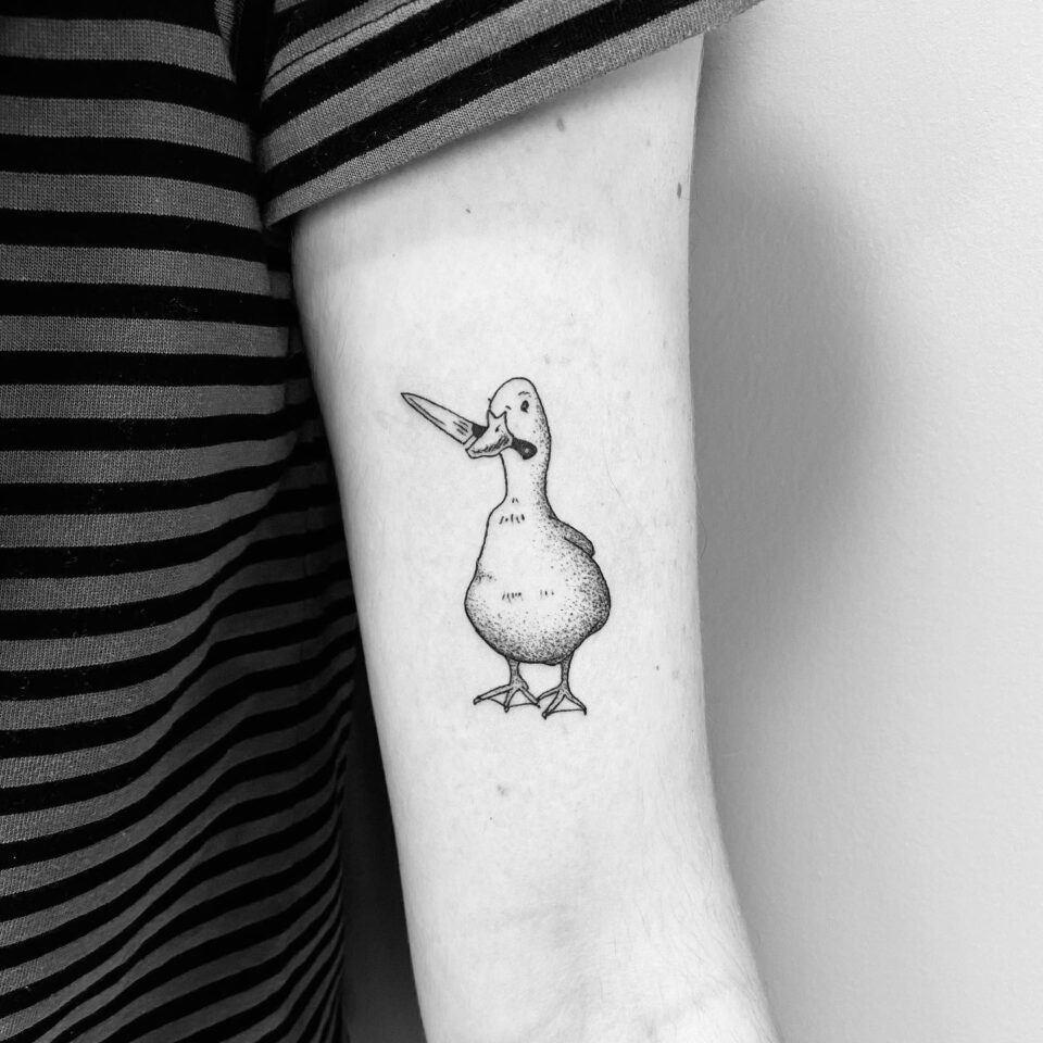 Tetování zvíře, pták, kachna s nožem na ruce