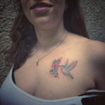 Tetování zvíře, pták, kolibřík s květinami na hrudi