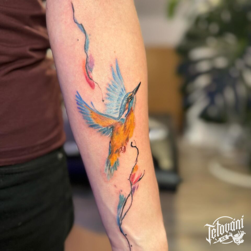 Tetování zvíře, pták, ledňáček na předloktí