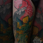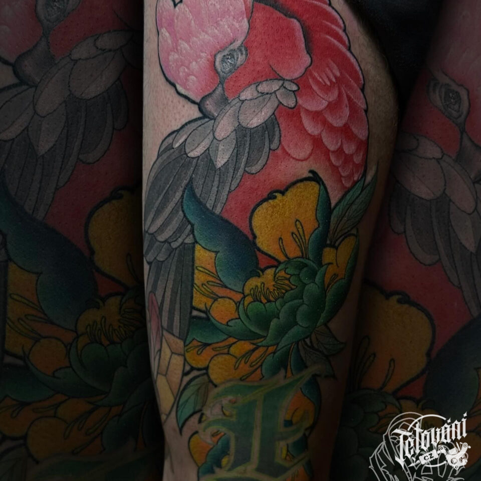 Tetování zvíře, pták, papoušek a květina na stehně