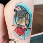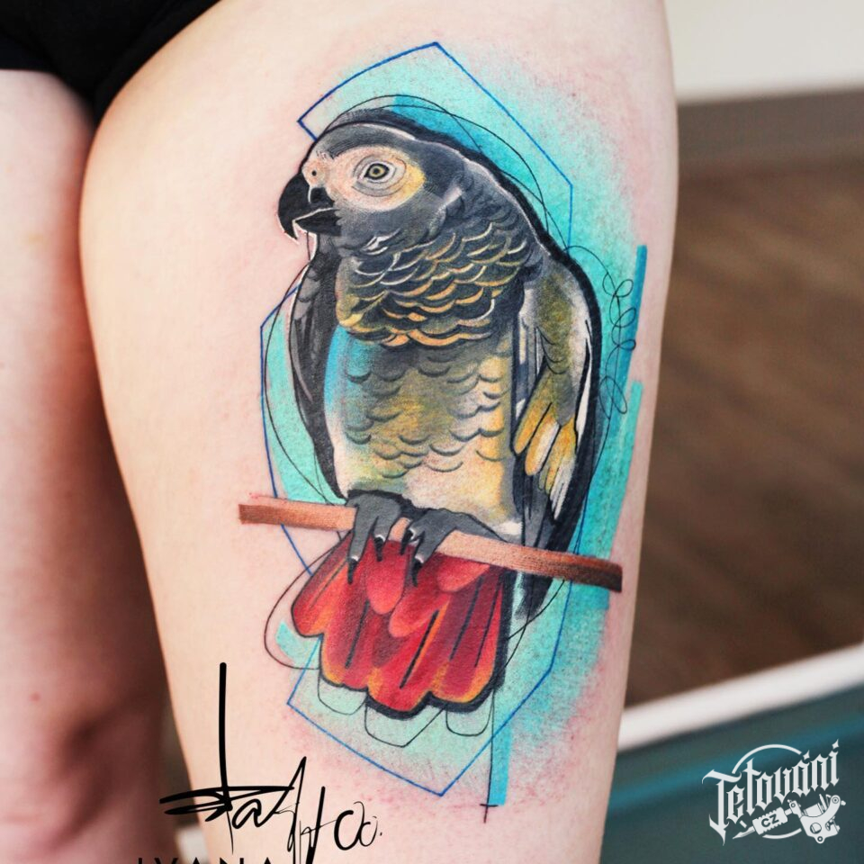 Tetování zvíře, pták, papoušek žako na stehně
