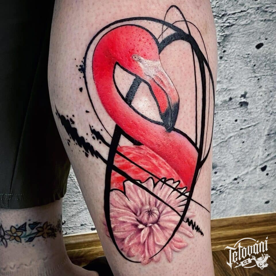 Tetování zvíře, pták, plameňák na lýtku