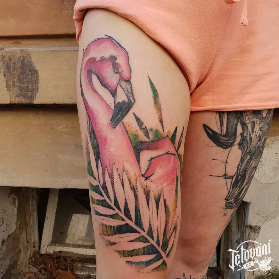 Tetování zvíře, pták, plameňák na stehně