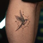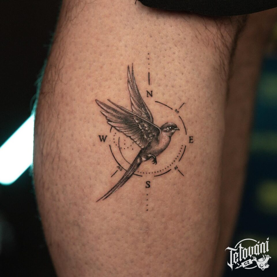 Tetování zvíře pták s kompasem na lýtko