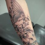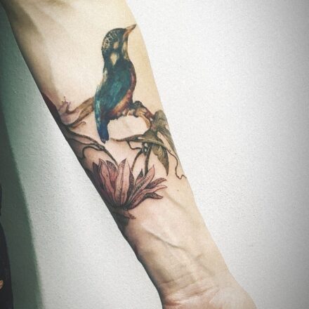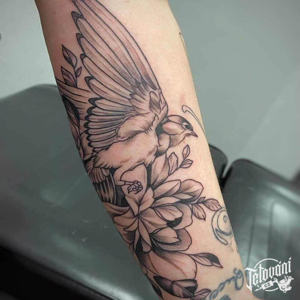 Tetování zvíře, pták s květinou na předloktí