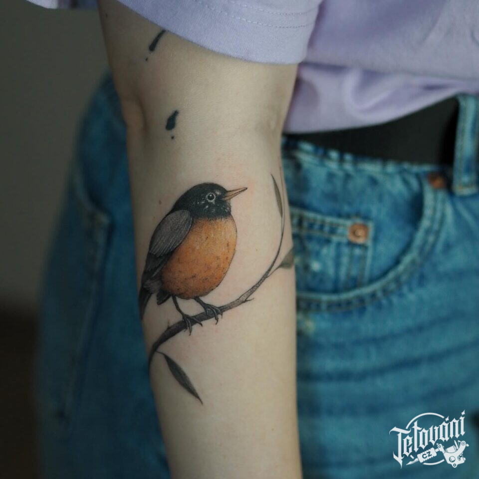 Tetování zvíře, pták sedící na větvičce na předloktí