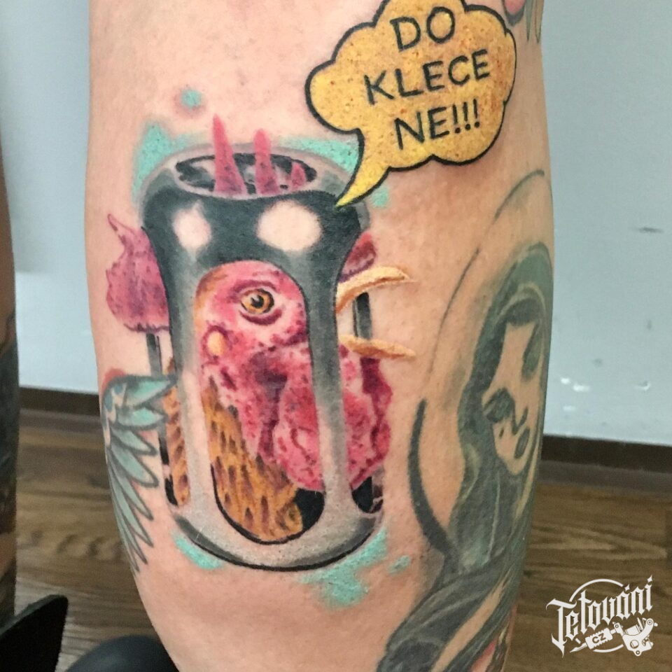 Tetování zvíře pták, slepice s nápisy na lýtko