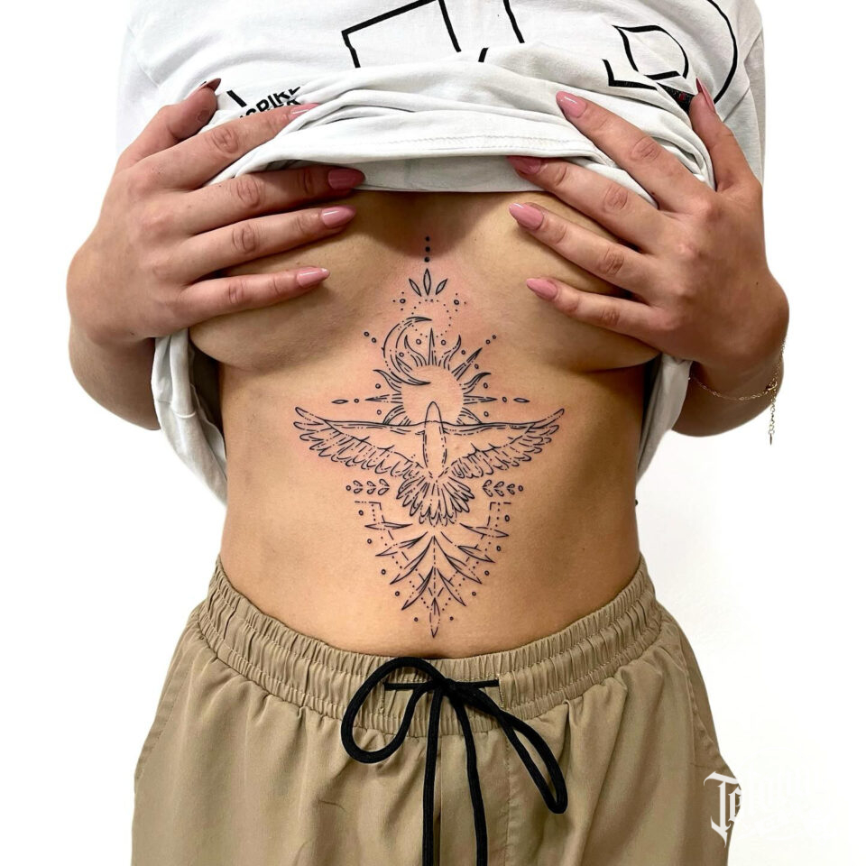 Tetování zvíře, pták, Slunce, ornamenty na břichu