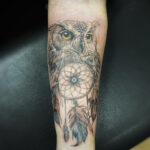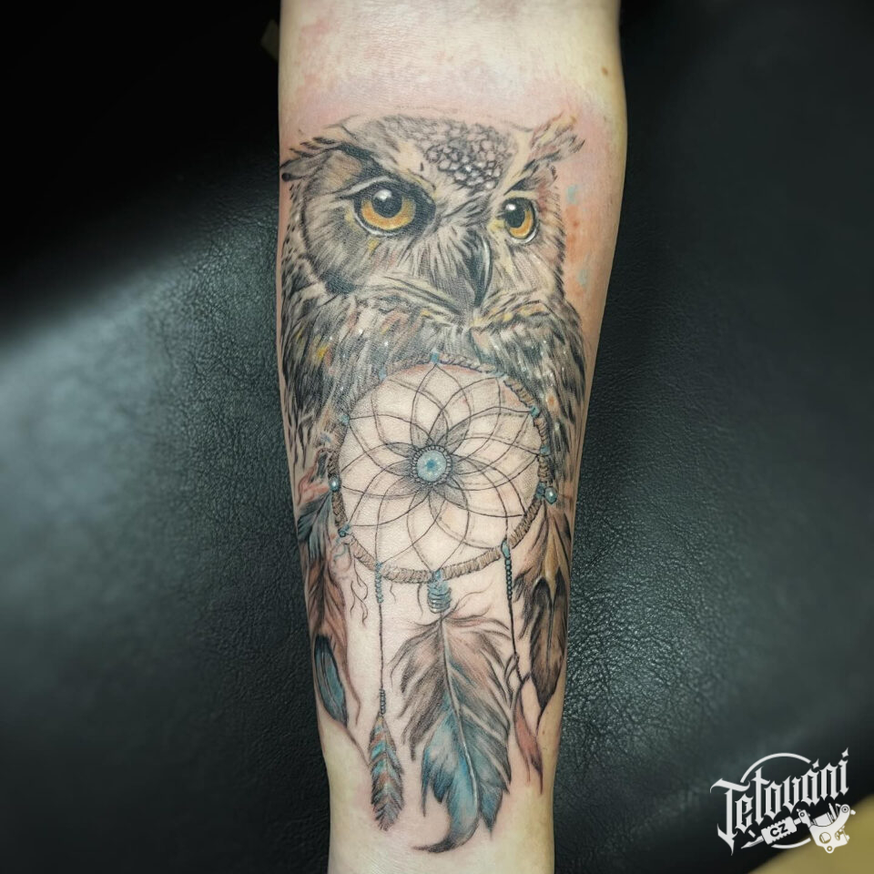 Tetování zvíře, pták, sova a lapač snů na předloktí