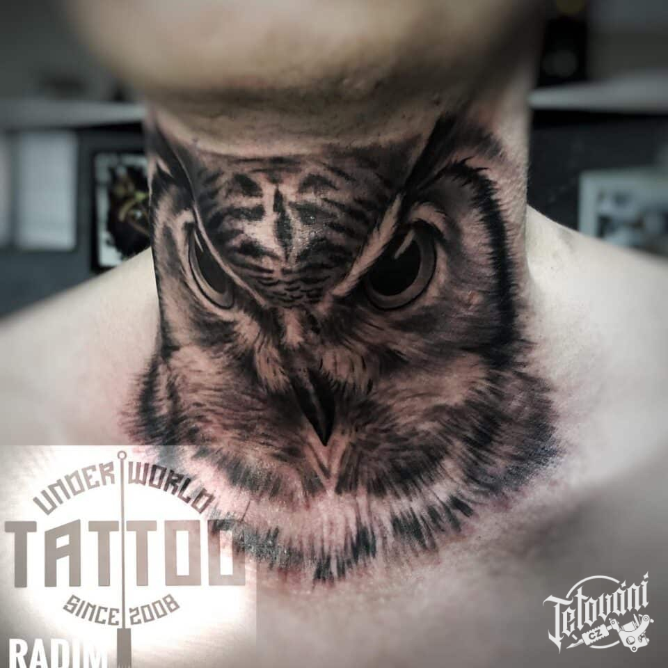 Tetování zvíře, pták, sova na krku