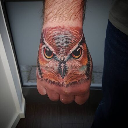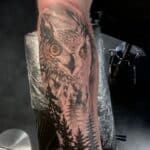Tetování zvíře, pták, sova na předloktí