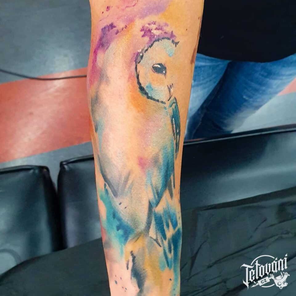 Tetování zvíře, pták, sova na předloktí
