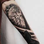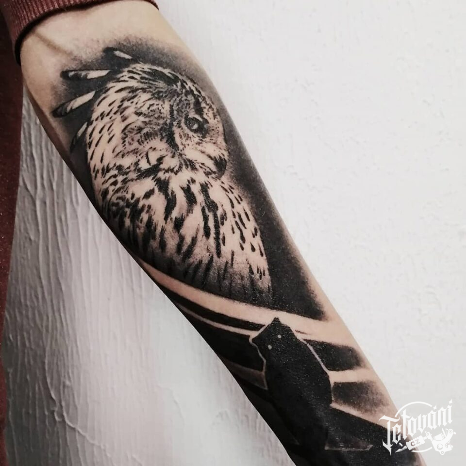 Tetování zvíře, pták, sova na předloktí