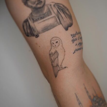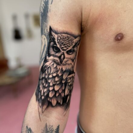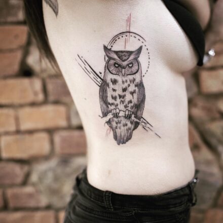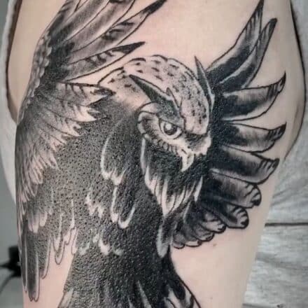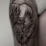 Tetování zvíře, pták sova na stehně