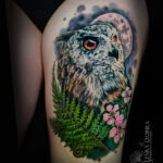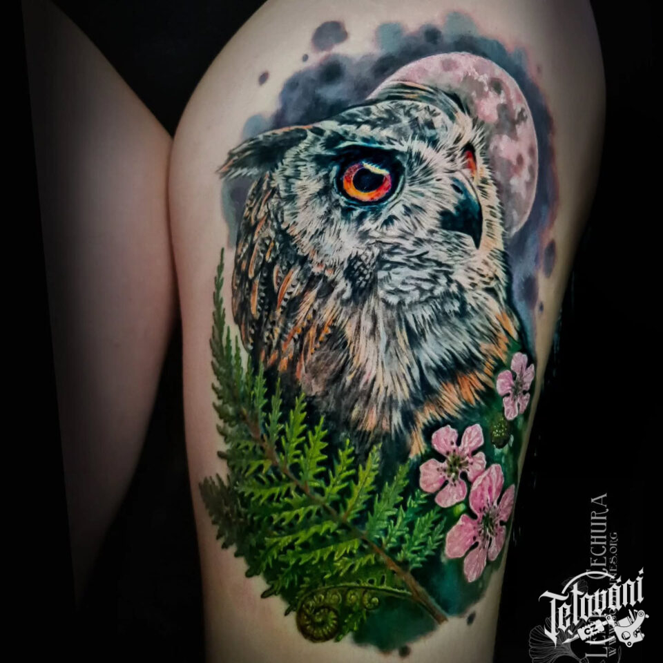 Tetování zvíře, pták, sova na stehně