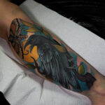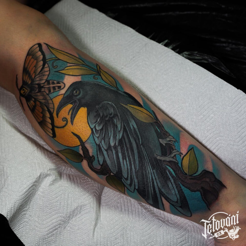 Tetování zvíře, pták, vrána a smrtihlav na předloktí