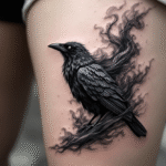 Tetování zvíře, pták, vrána s kouřem na stehně