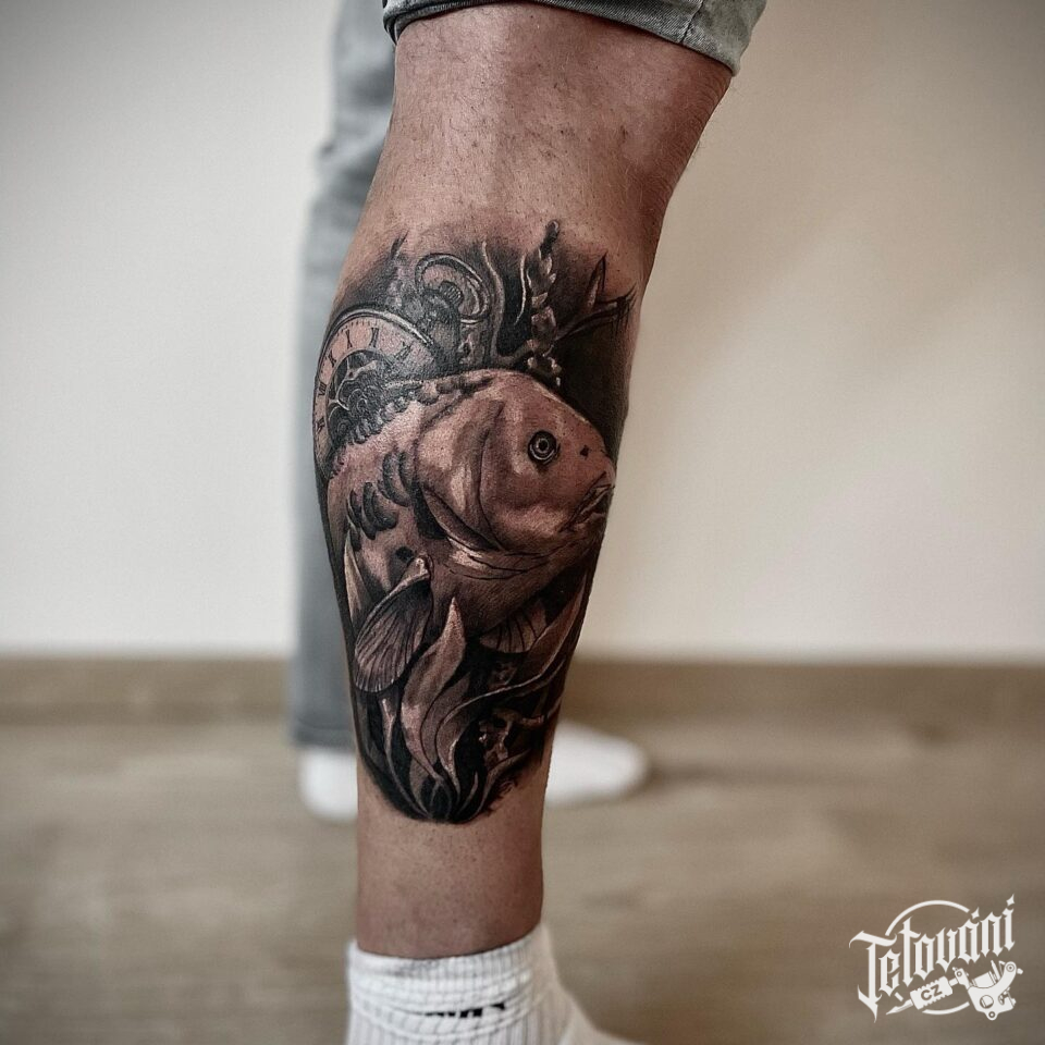 Tetování zvíře ryba, hodiny na lýtko