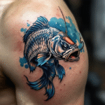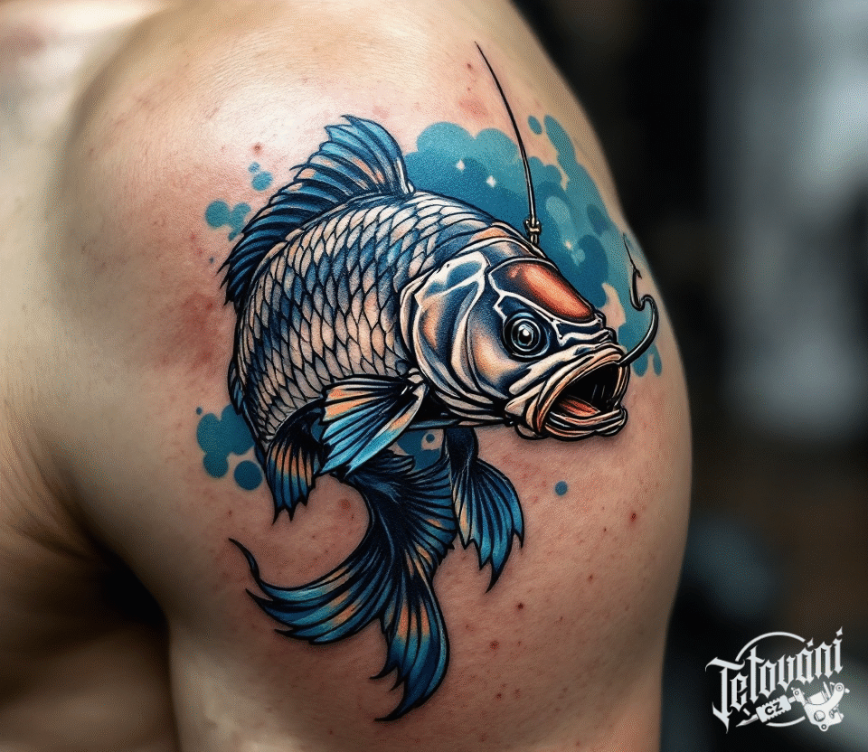 Tetování zvíře, ryba, kapr na háčku na rameni