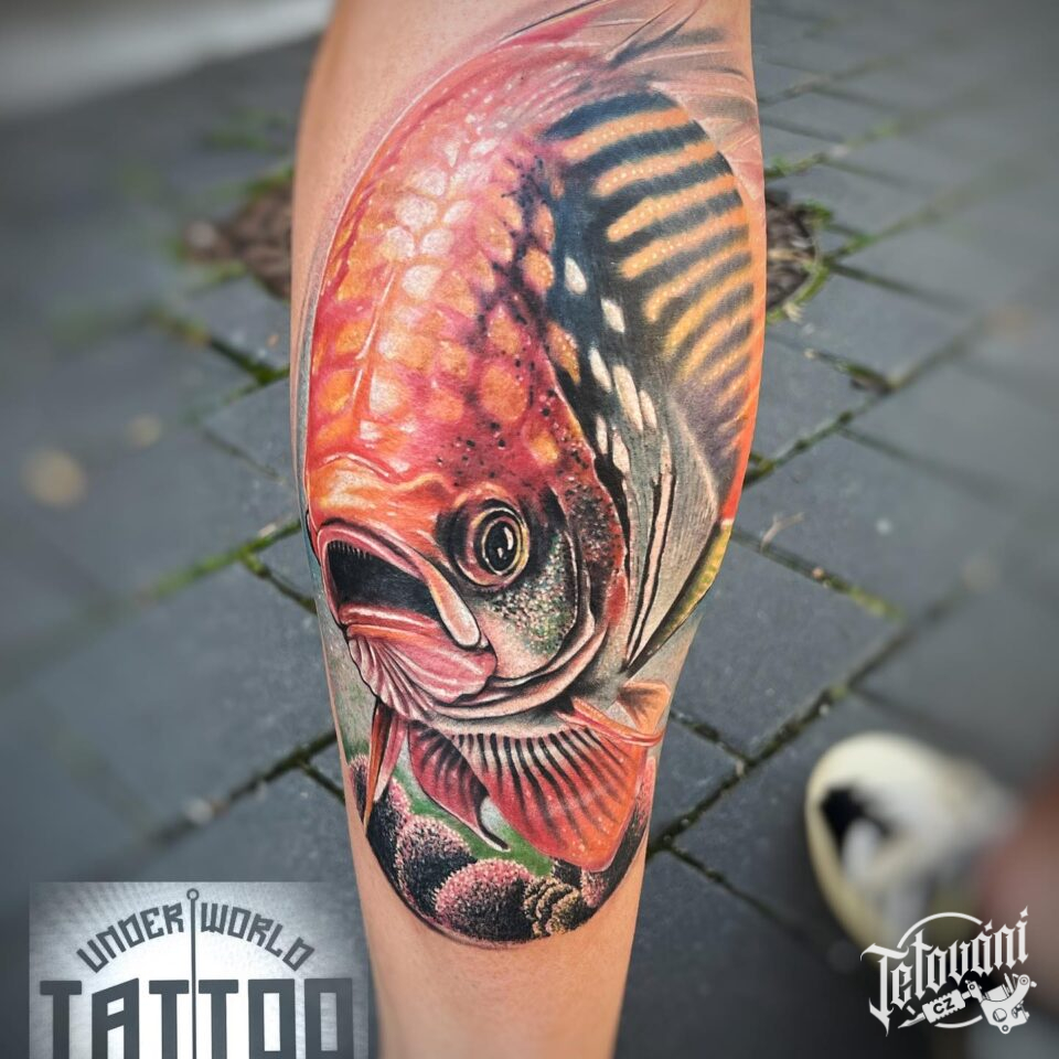 Tetování zvíře, ryba na lýtku