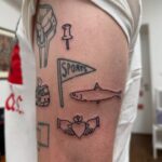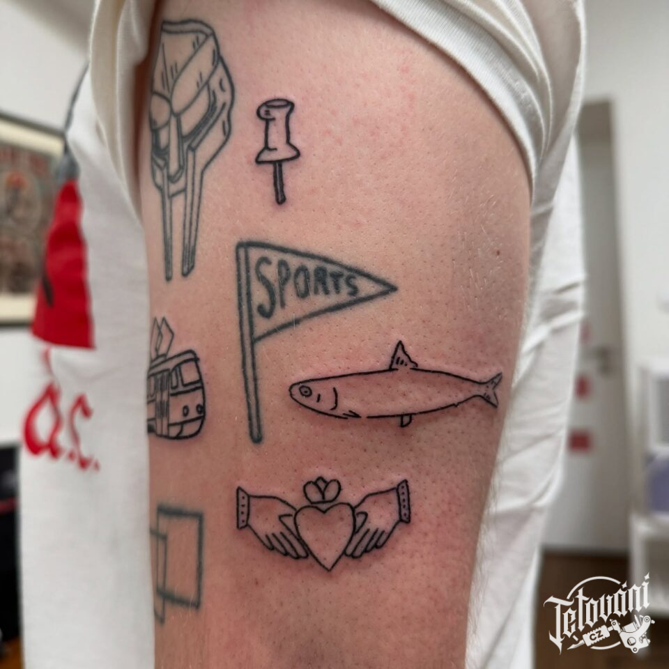 Tetování zvíře, ryba, ruce a srdce, předmět na rameni