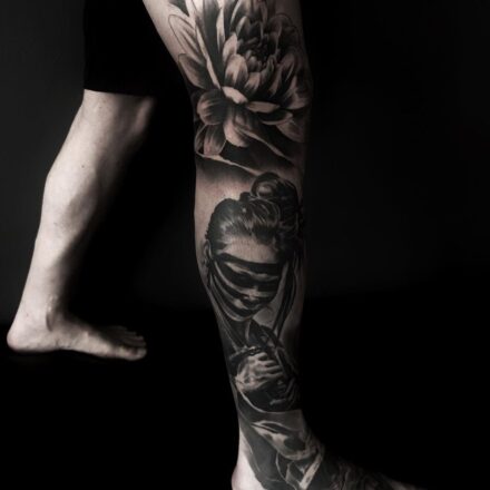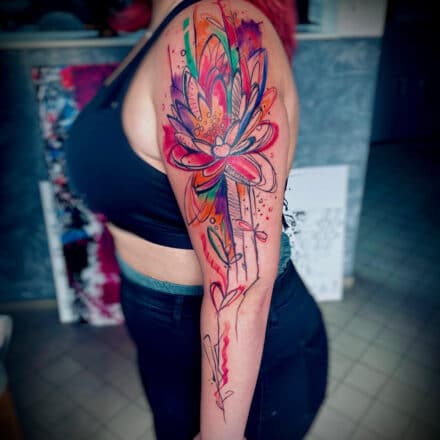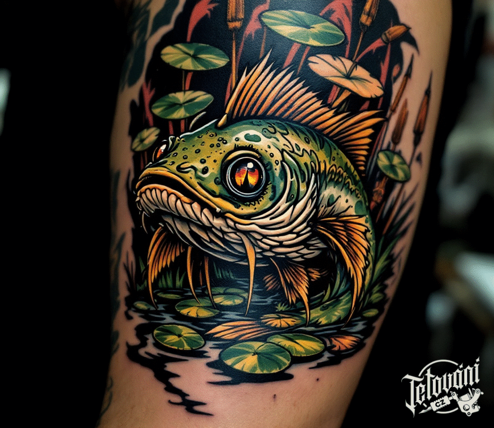 Tetování zvíře, ryba, sumec s lekníny na ruce