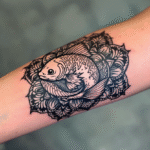 Tetování zvíře, ryba, sumec s mandalou na předloktí