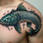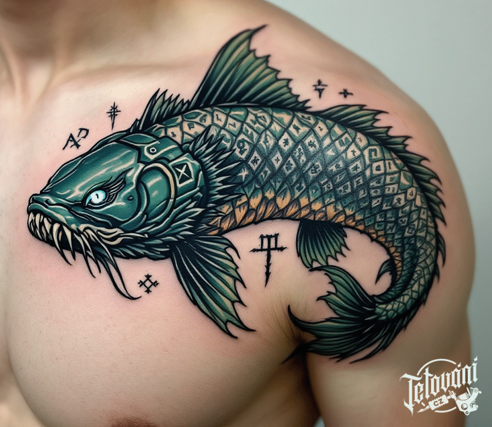 Tetování zvíře, ryba, velký zelený sumec na hrudníku