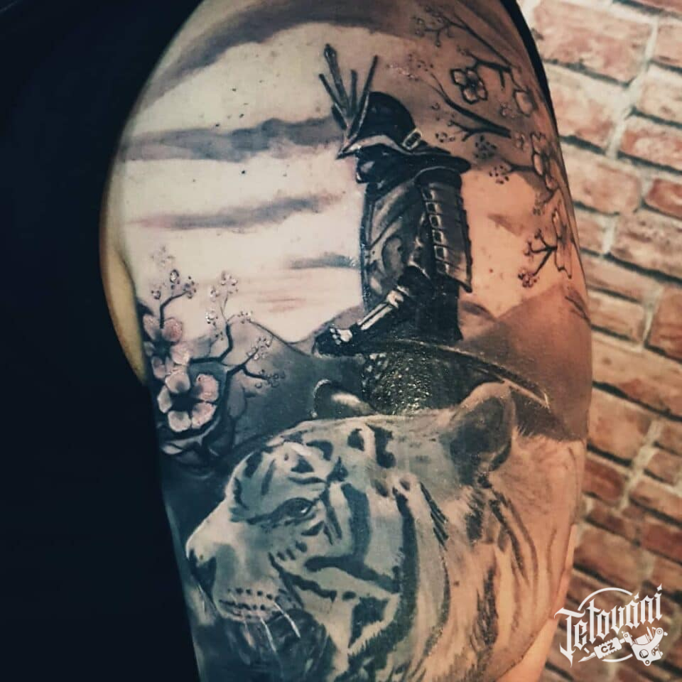 Tetování zvíře, samuraj a tygr na rameni