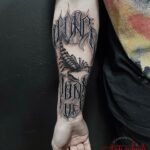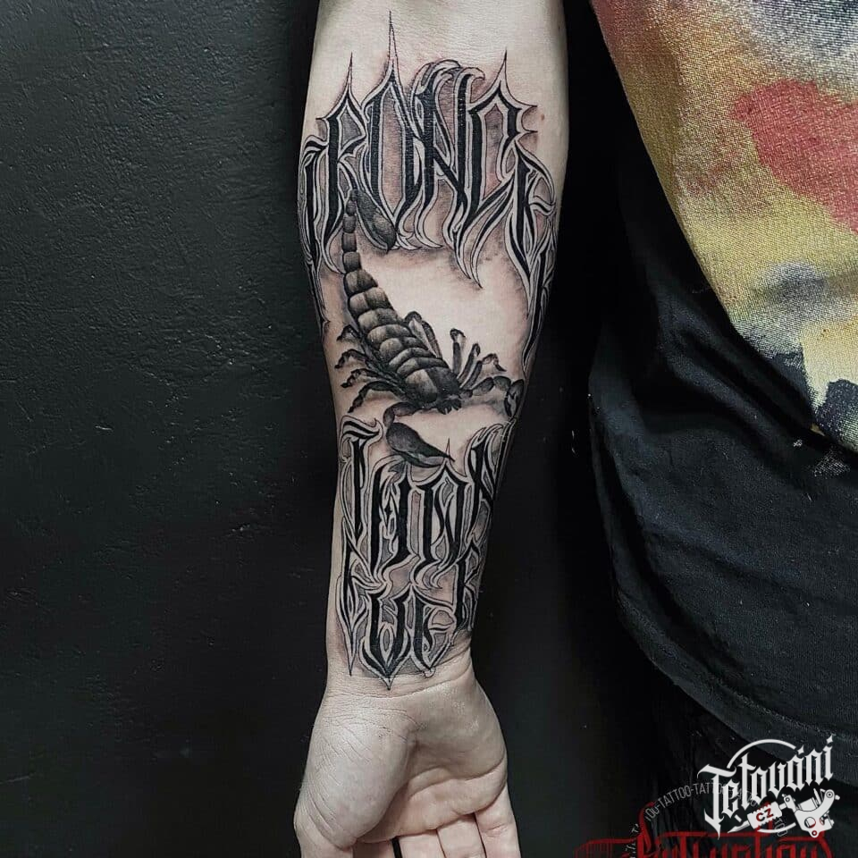 Tetování zvíře, škorpion, štír a nápisy na předloktí