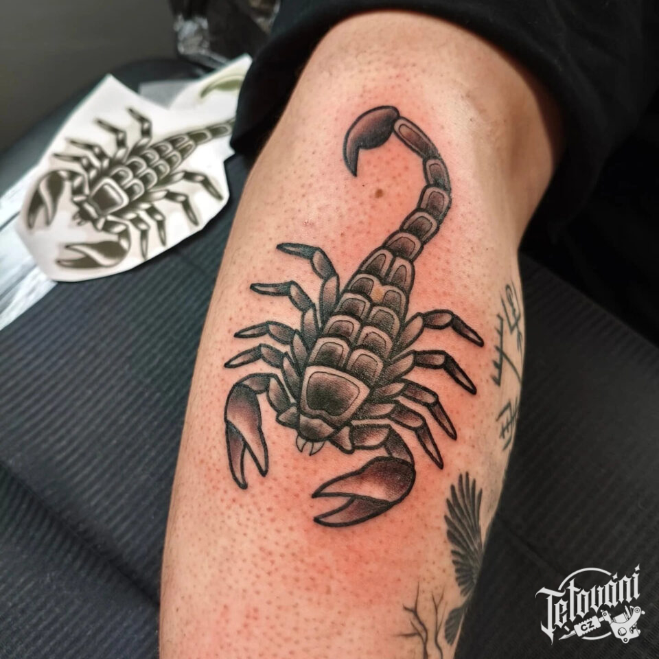 Tetování zvíře, škorpion, štír znamení zvěrokruhu na lýtku