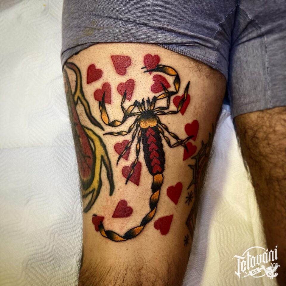 Tetování zvíře, škorpion, štír znamení zvěrokruhu na stehně
