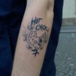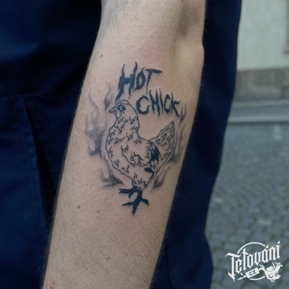 Tetování zvíře slepice s nápisem na předloktí