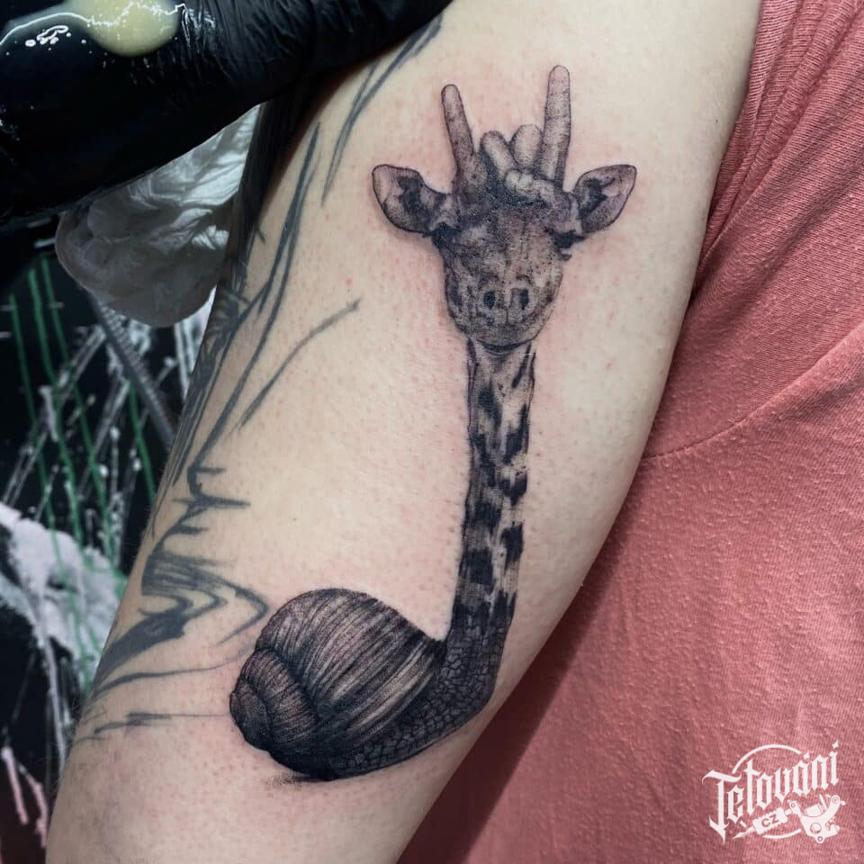Tetování zvíře, šneko-žirafa na paži
